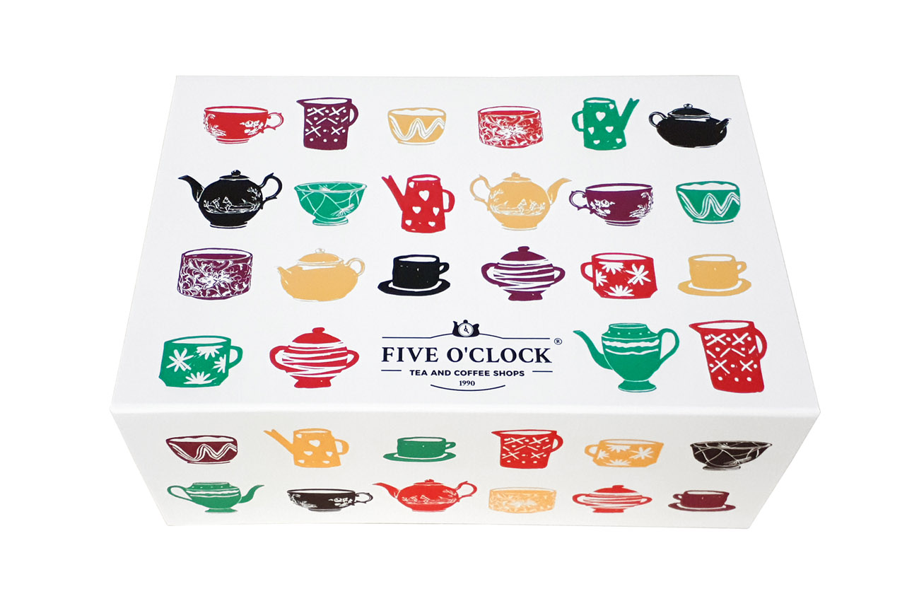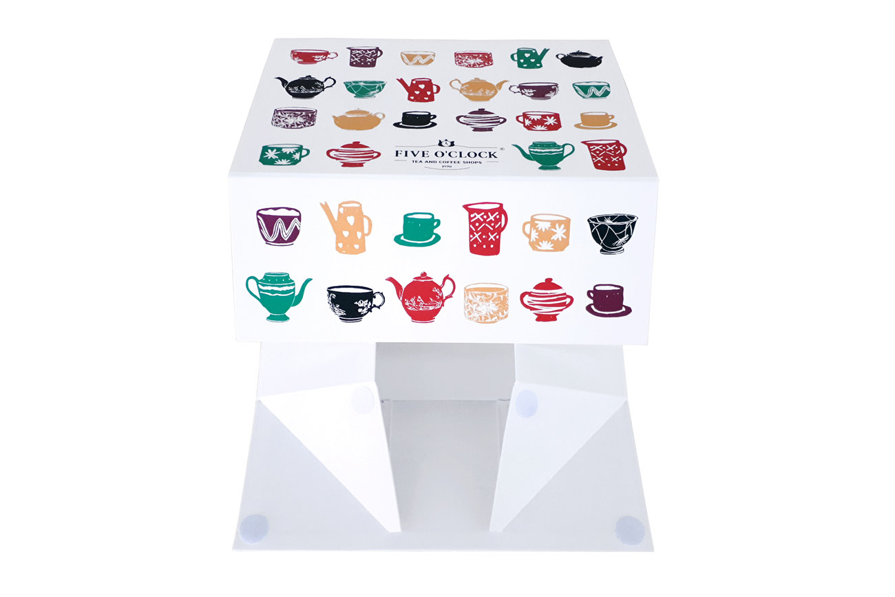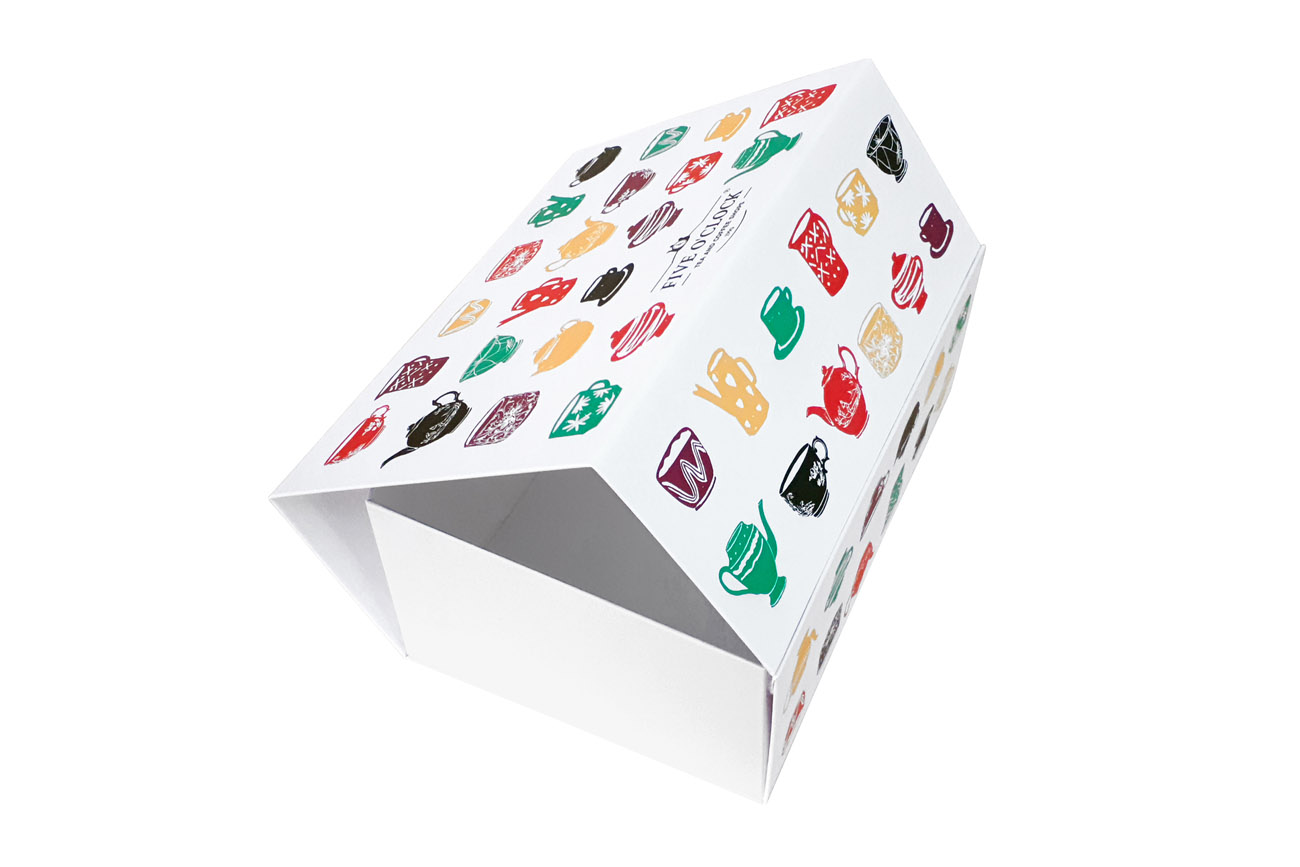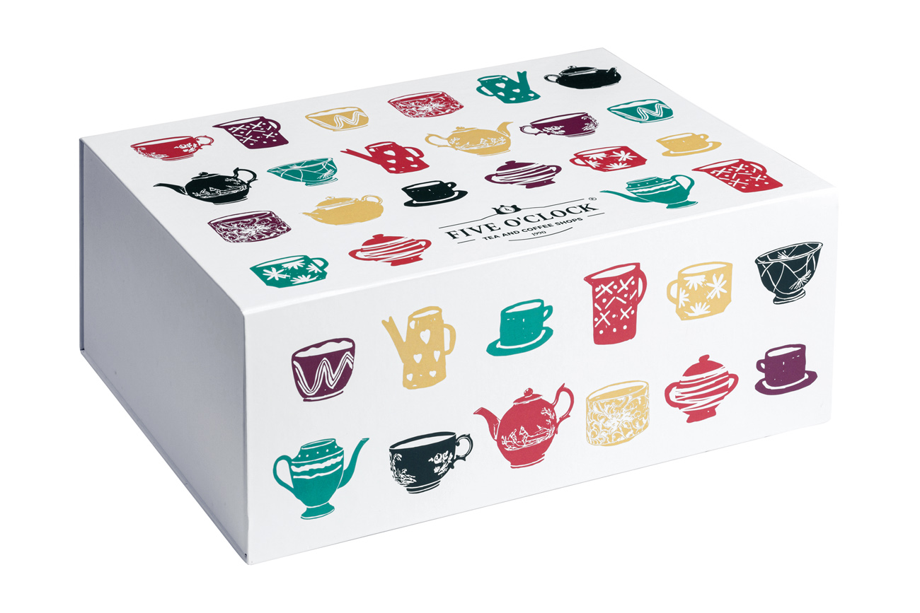 With a design that is both functional and beautiful, Five o’clock, the workplace coffee & tea experts, have created a decorative collapsible rigid box with velcro closure and personalized offset print.